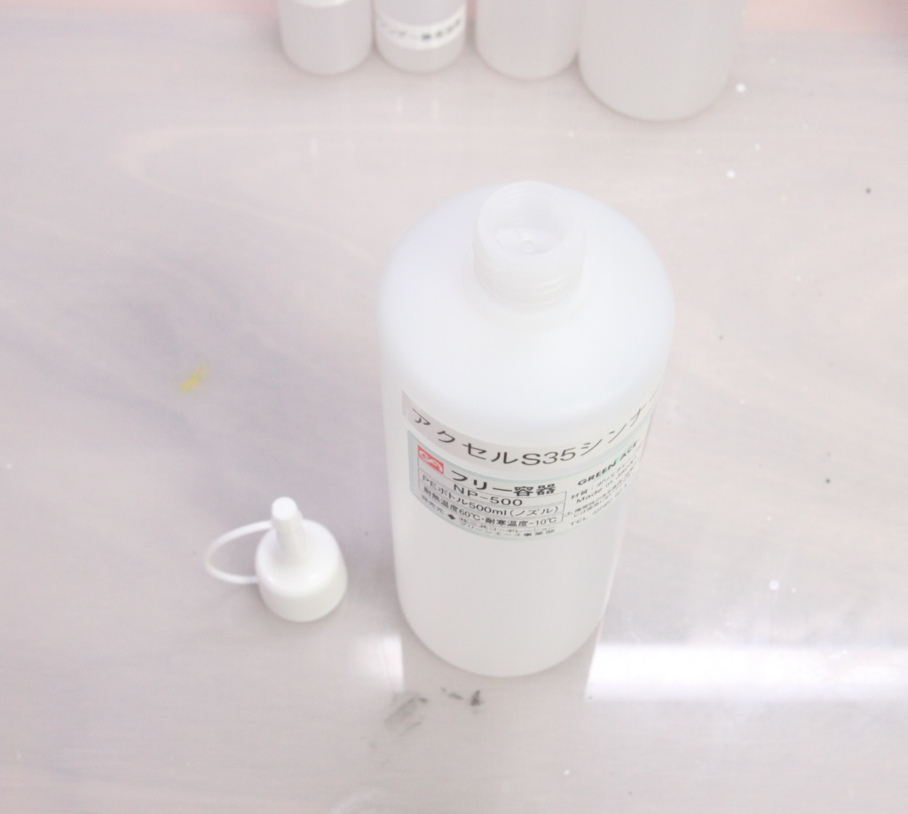 アーチスト・ホワイトスピリットを入れたフリー容器は100ml用の他に、60ml300ml500mlを様々な溶剤に使っています。