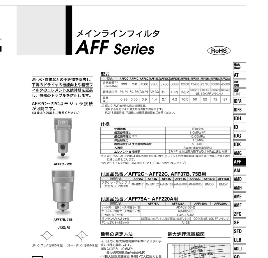スーパーミストセパレーターの手前にメインラインフィルターを取り付けると、スーパーミストセパレーターのエレメントの負担を軽減でき、寿命を延ばせるみたいなので、定格流量が300L/minのAFF2C-02も取り付ける事にしました。