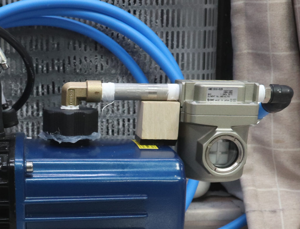 オイルキャップに取り付けたPT1/4エルボや継手は、フィルター2つの重量程度では問題無さそうだったので、フィルター同士はニプルで接続して、両方とも真空ポンプに固定する事にしました。