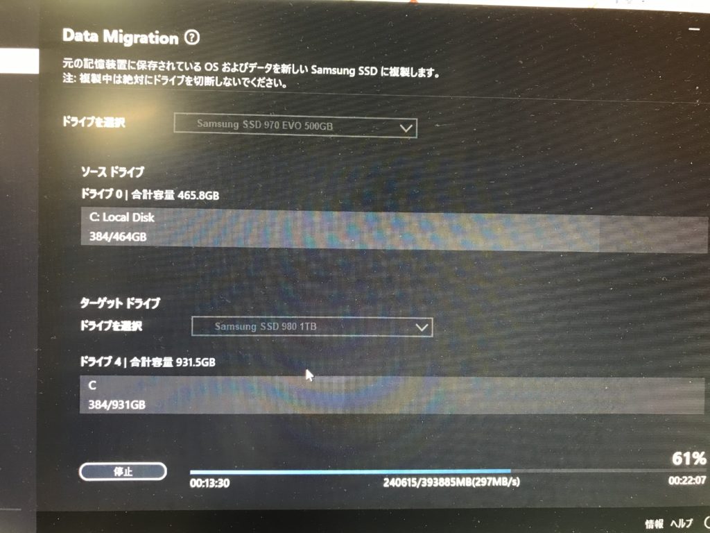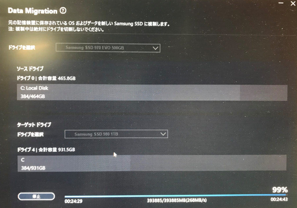 パソコンのシステムドライブとして使っている、サムスン SSD 970EVO 500GBからサムスン SSD 980 1TBへの、400GB程度のデータのコピーは、25分ほどで終わりました。