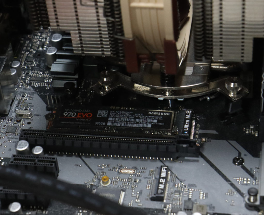 2つあるSSD用のM.2ソケットの内、コネクターでシステムドライブ用に推奨されているのは、グラフィックボードの取り付けているPCI-eスロットとCPUの間だったので、グラフィックボードを取り外してから、交換する必要がありしまた。