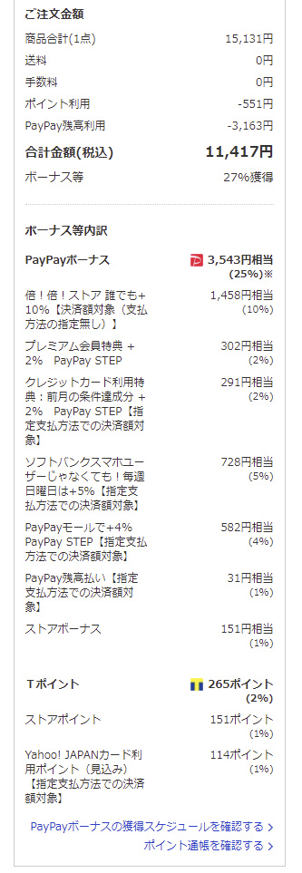 人によるのですが、サムスン SSD 980 1TBを買った時には、自分の場合はPayPayボーナスとTポイントを合わせて27%ポイント還元の対象でした。還元率律には上限があるので、実際は25%ちょっとでした。
