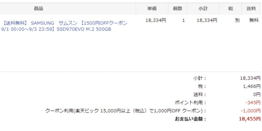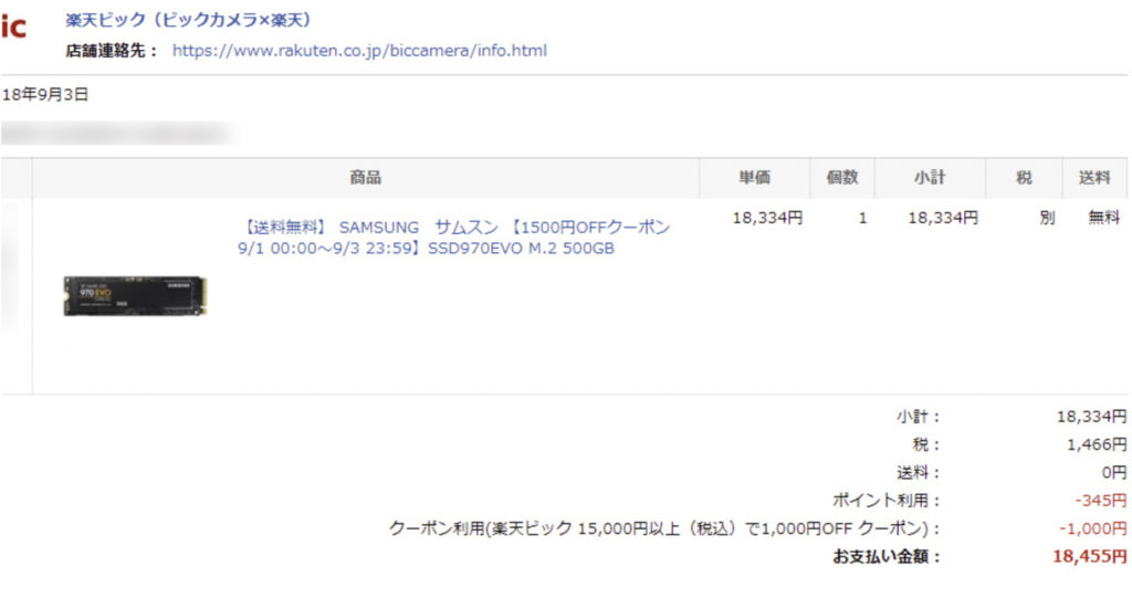 2018年9月に購入したのと同じビックカメラ楽天店の970EVO 500GBの最終的な価格販売価格は、購入時と半値近くになっていたので、世の無常を感じますね。