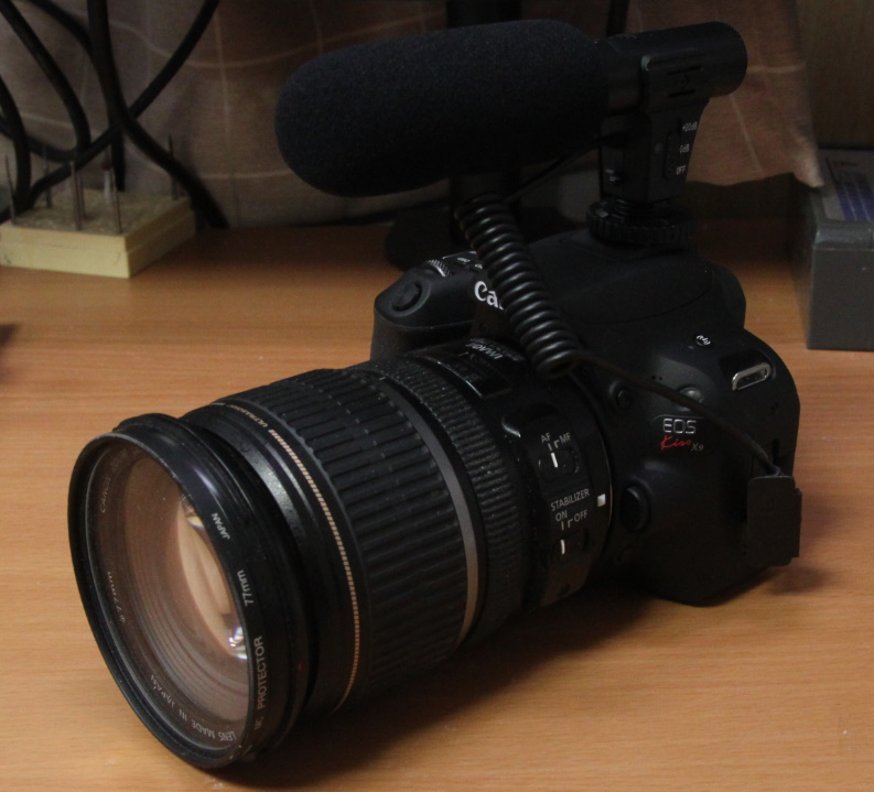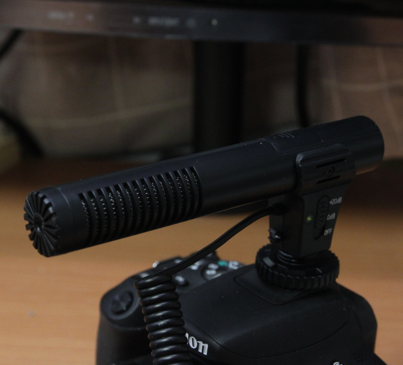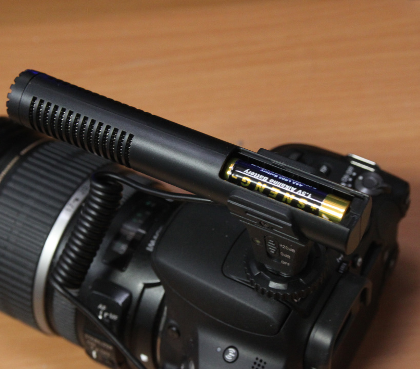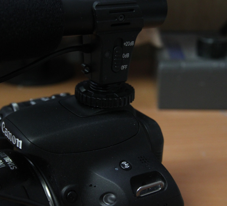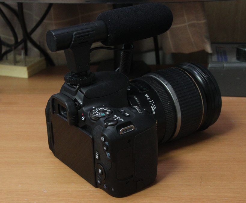 EOS Kiss X9で動画撮影する際に、カメラ内蔵マイクだと、オートフォーカスの動作音を激しく拾うので、アマゾンで売られている安価な外付けマイクを取り付けてみました。