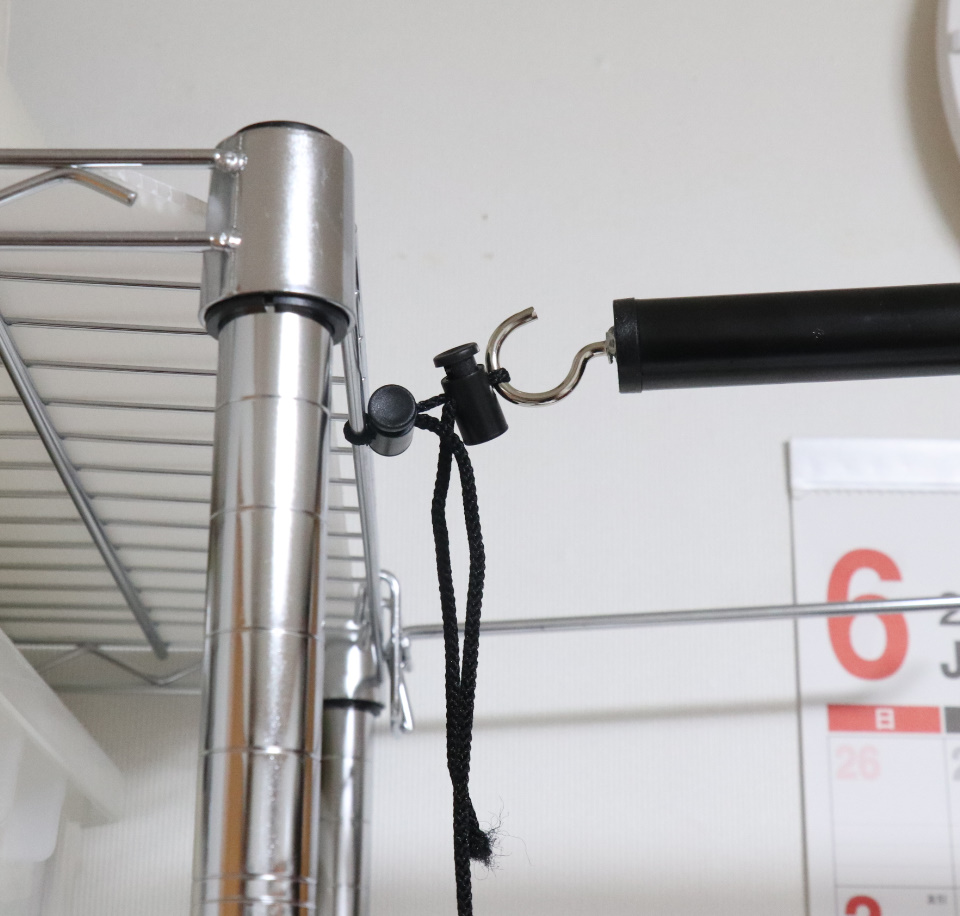 上からのライトバンクは、錘を吊るす部分を、セリアで買った紐とコードストッパを使って、棚に括り付けました。