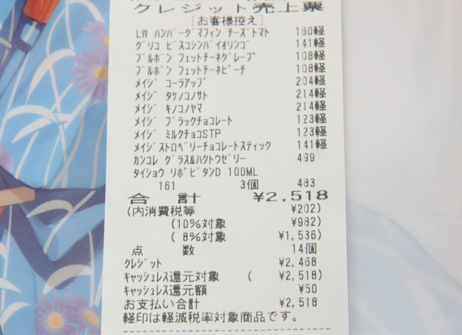 軽減税率とは別にクレジットカードでの支払いだったので、会計時に2%の割引を受けていて、軽減税率対象品は、増税前よりも安くなっています。