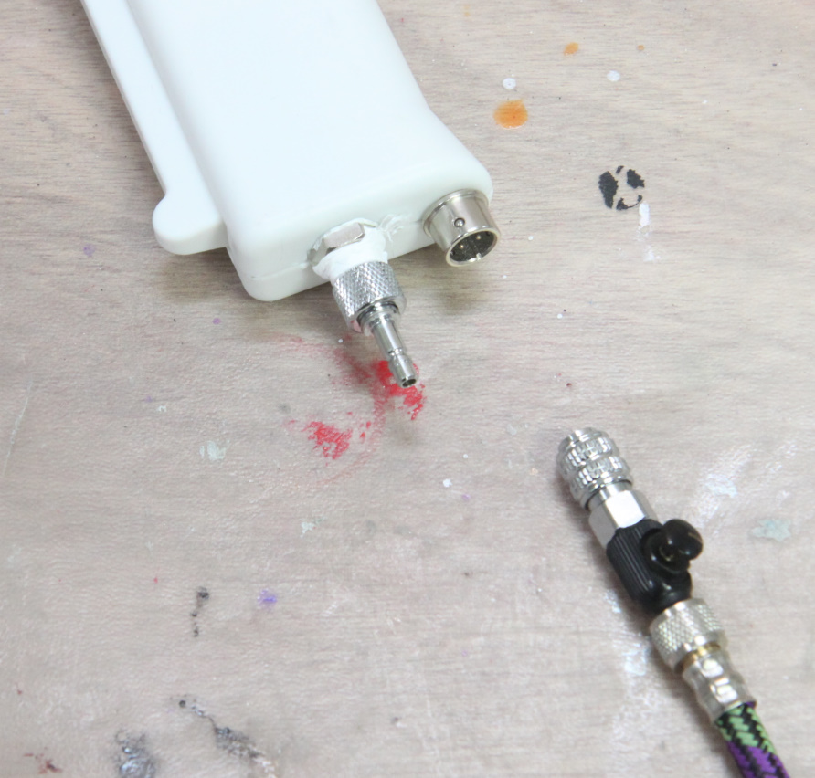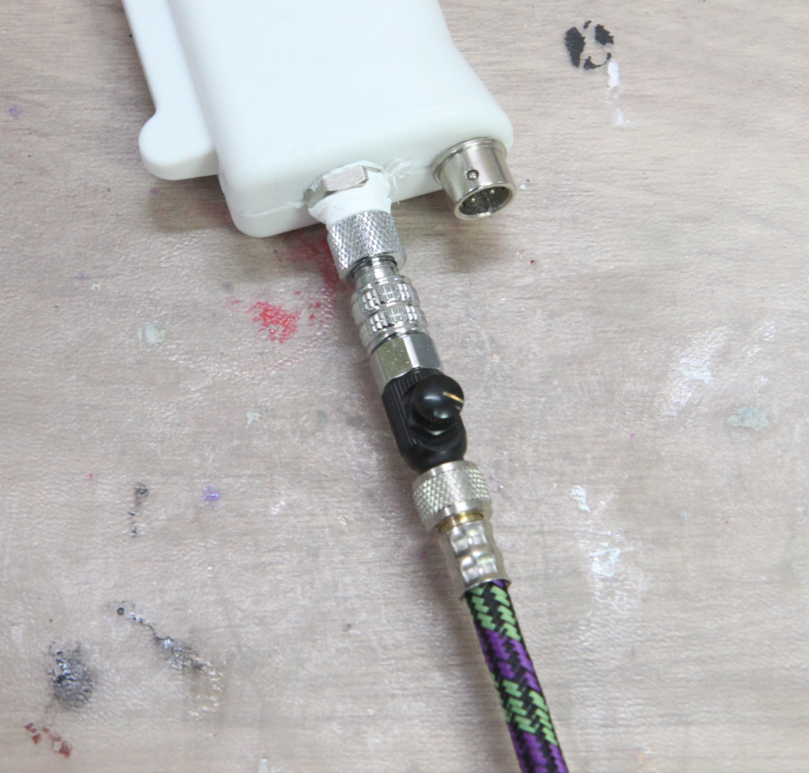 夜間に釘打ち用のコンプレッサーは使いたくないので、塗装用のワーサー30Dにも使える様に、エアー入り口の部品を交換して、クレオスのカプラージョイントを取り付けています。