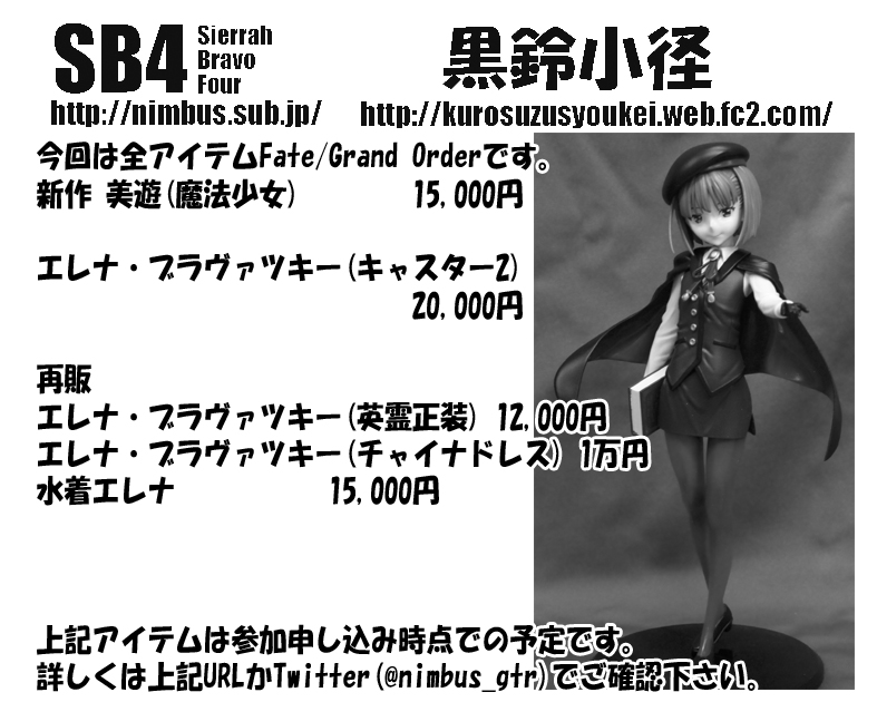 今回の販売アイテムは全てFate/Grand Orderからで、新作は美遊(魔法少女)、エレナ・ブラヴァツキー(キャスター2)を、再販は、エレナ・ブラヴァツキー(英霊正装)、 エレナ・ブラヴァツキー (チャイナドレス)、水着エレナを予定しています。