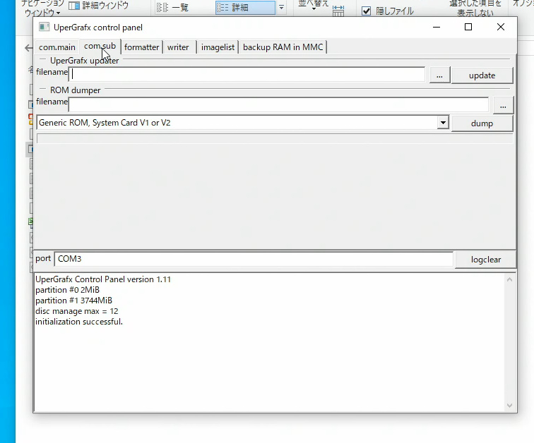 Huカードのリッピングは「sub com」のタブで行います。