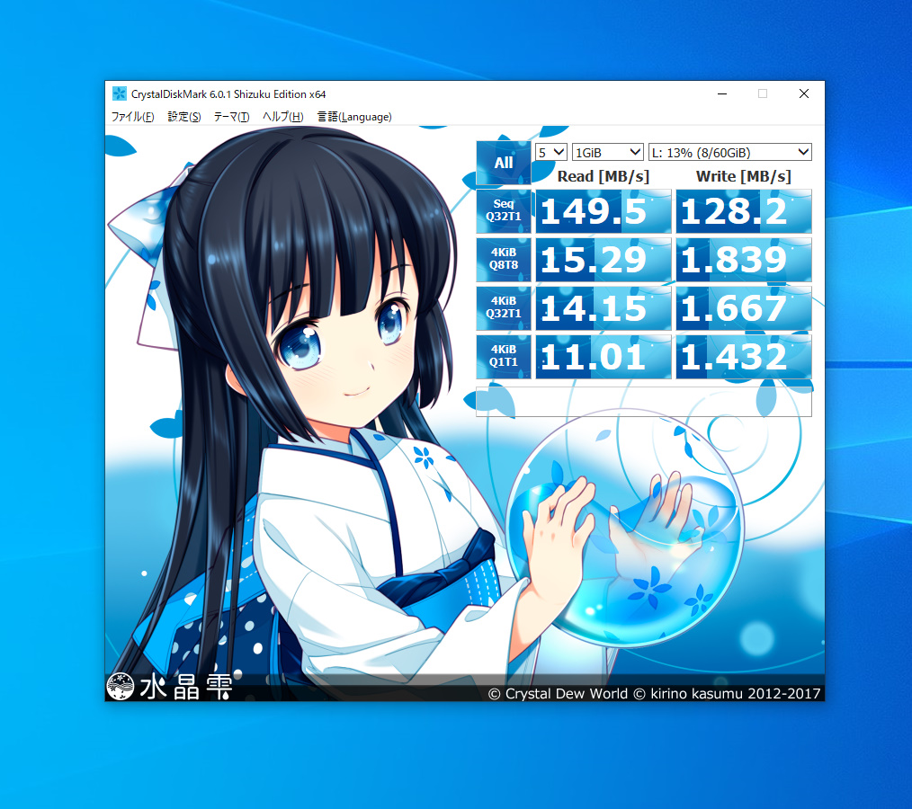 読み込みは149MB/s後半、書き込みは127~128MB/s前後でした。