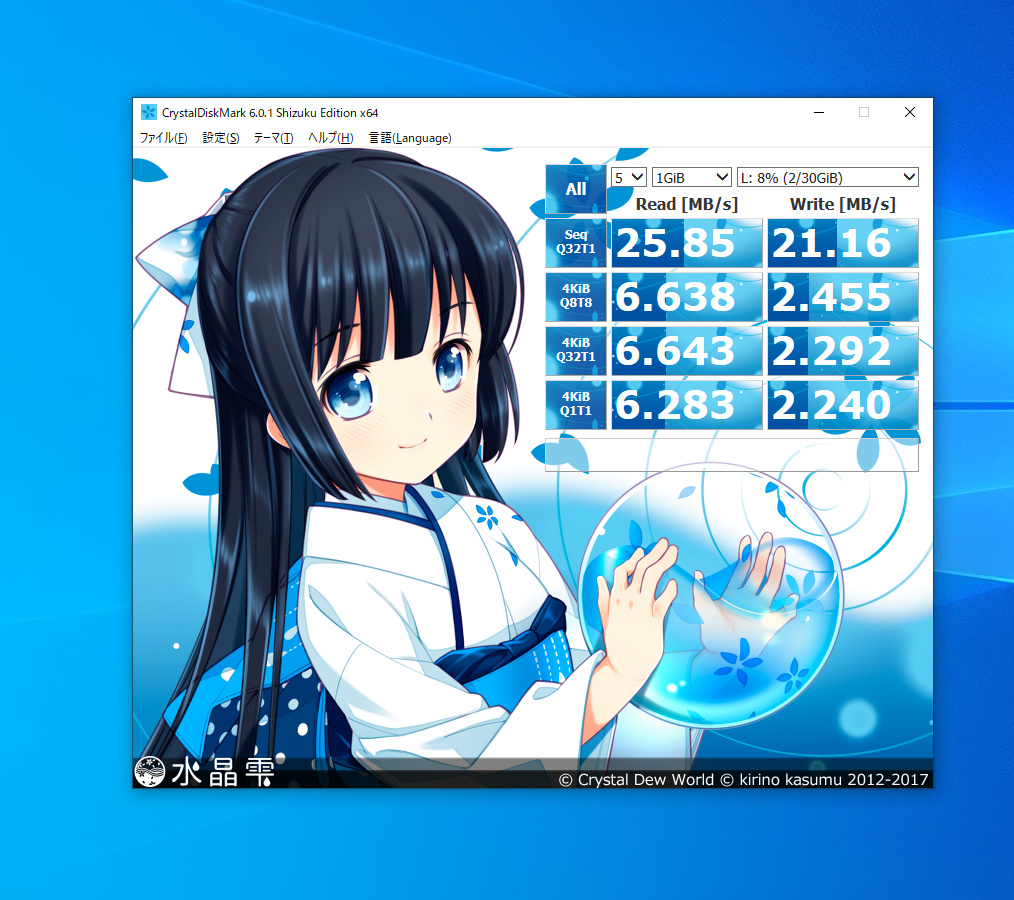 ベンチマークでは読み込みが25MB/s後半、読込が21MB/s前半でした。