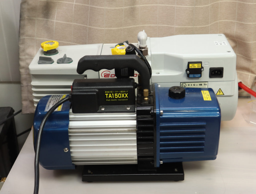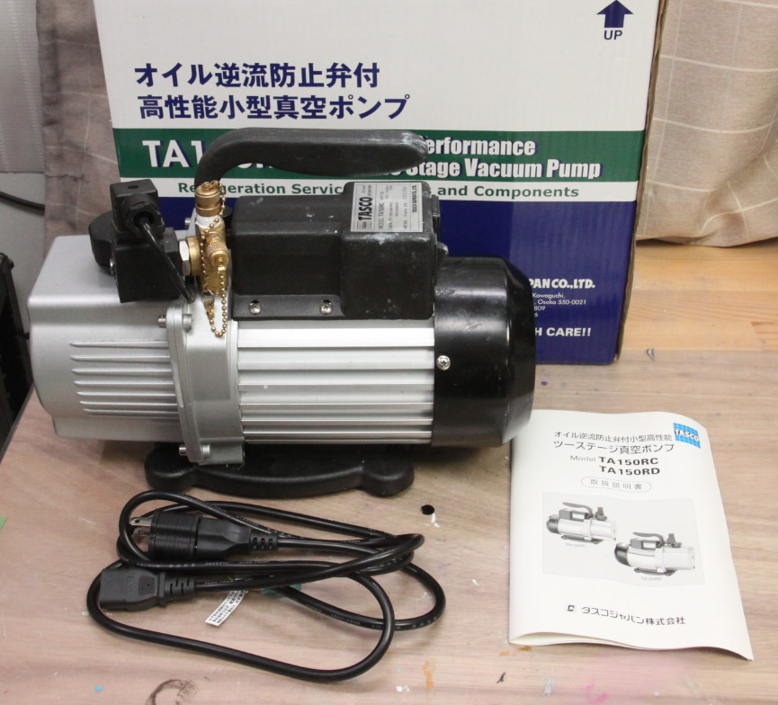 業務用真空ポンプの中古品を扱う専門業者に問い合わせてみたら、家庭用100V電源で使える仕様の物で外観の程度が極めて良い個体を、手頃な価格(TA150RCの新品よりは安い)で購入する事が出来ました。