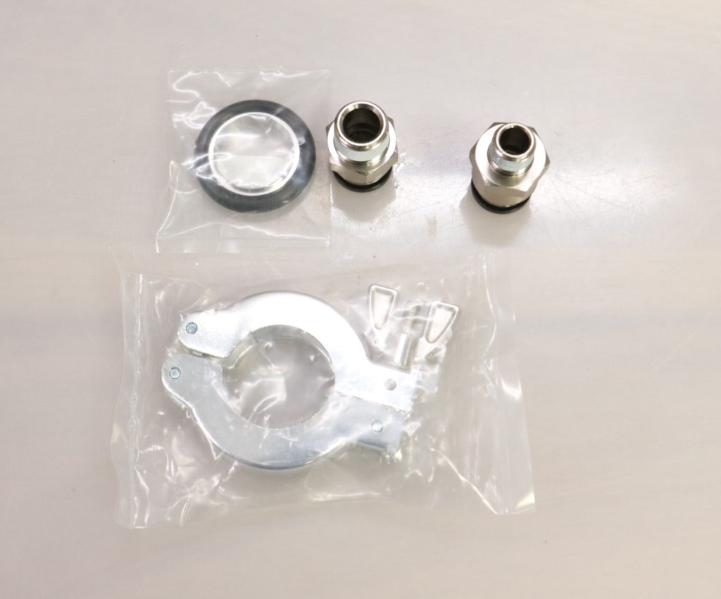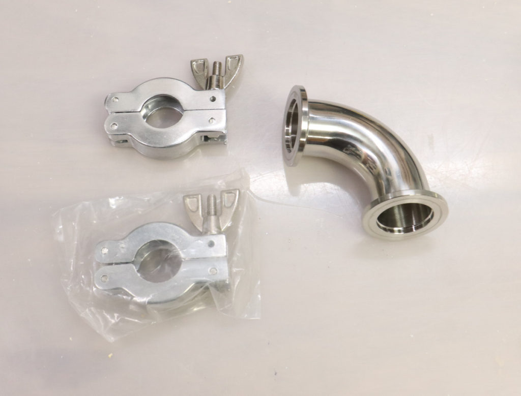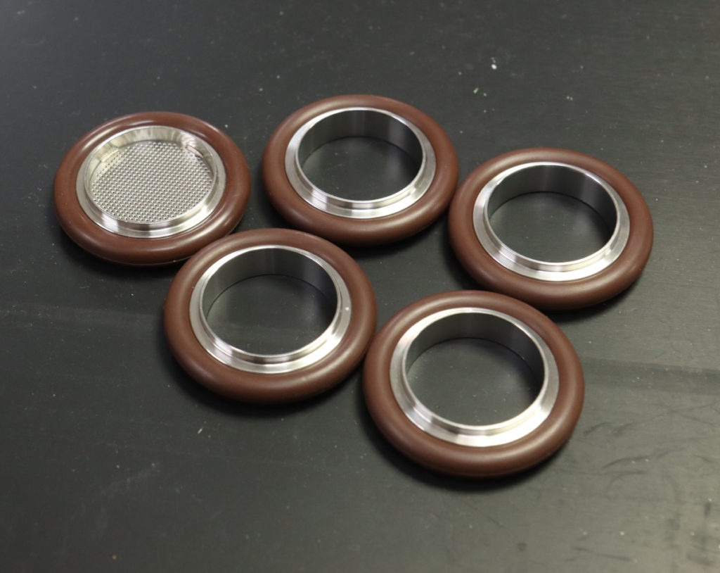 写真の上は、左からNW25のクランプ用センターリング、3/8PTオスと1/4PTオスの12mmチューブ対応の継手部品です。下はNW25用クランプです。