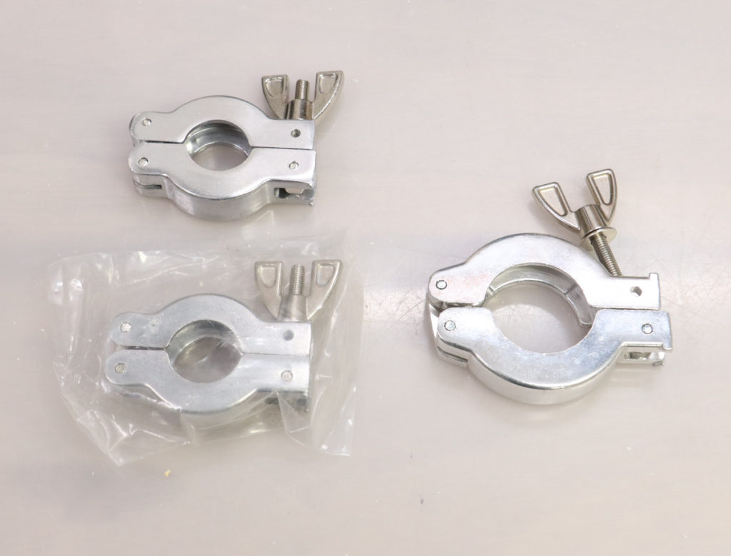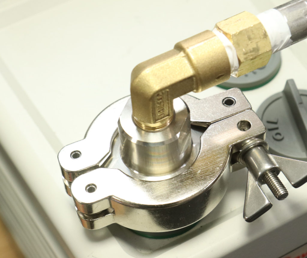 エアツールや真空ポンプの継手の様に、ネジではなく、専用のクランプを使って固定する方式なので、着脱が簡単なのと、内径が大きいのが特徴です。