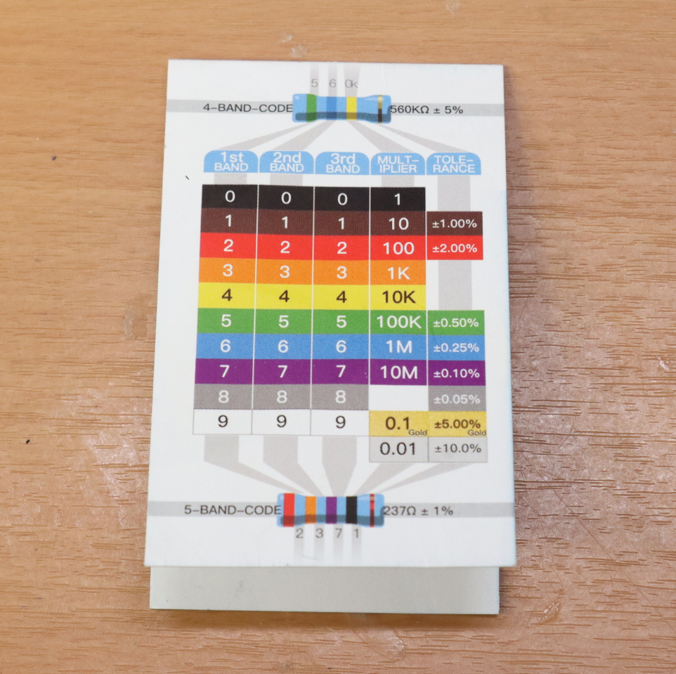 抵抗のカラーコードは、私は一覧表を頼りに時間を掛けないと読めないのもあるのですが、印刷されたカラーコード自体が間違っている事もあるので、抵抗値はテスターで測定するのが手っ取り早くて確実です。
