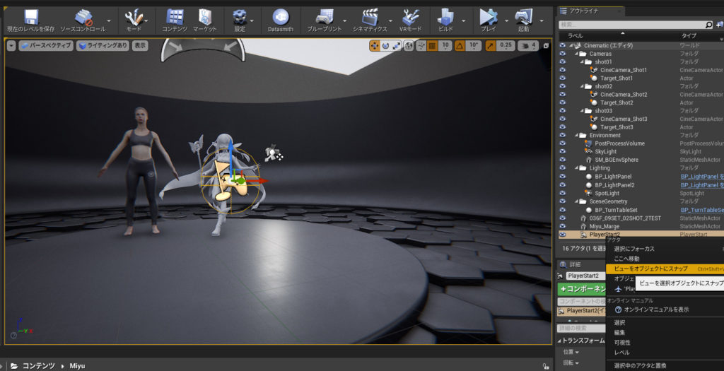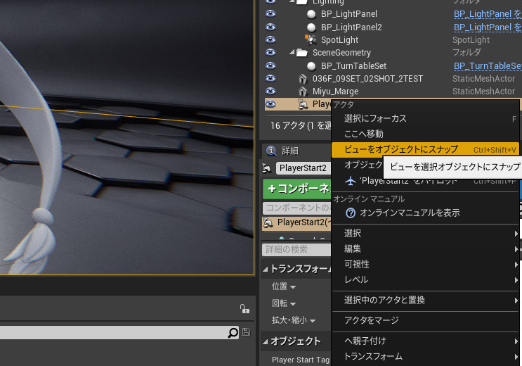 PlayStartアクタを選択して、右クリックから「ビューを選択オプシェクトにスナップ」を選択すれば、PlayStartアクスタで設定した視点にビューボードの視点を常に同じ位置にする事が可能です。