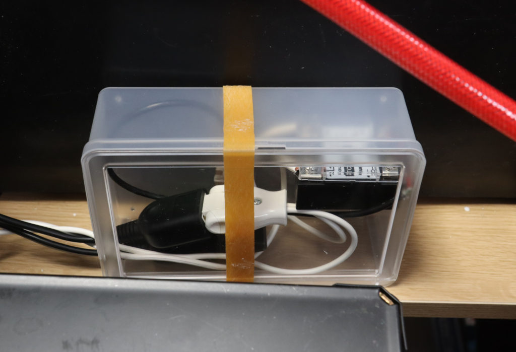 ケースの側面に穴を開けた為、蓋がロックされなくなったのて、ゴムバンドで止めています。出来れば、蓋をロックする為の金具を取り付けたい所ですが、ソリッドステートリレーのパイロットランプの点灯も確認出来るので、実用上はこれでも十分ではあります。