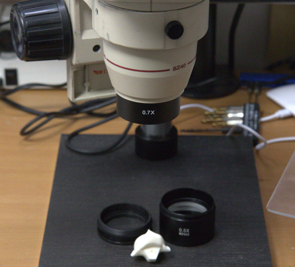 フィギュアの顔パーツを筆塗りするなら、10×20(10倍、視野数20)の接眼レンズと0.7倍のレンズ、0.67倍ズームの組合せ(倍率は4.69)で丁度良い感じです。