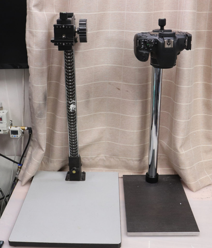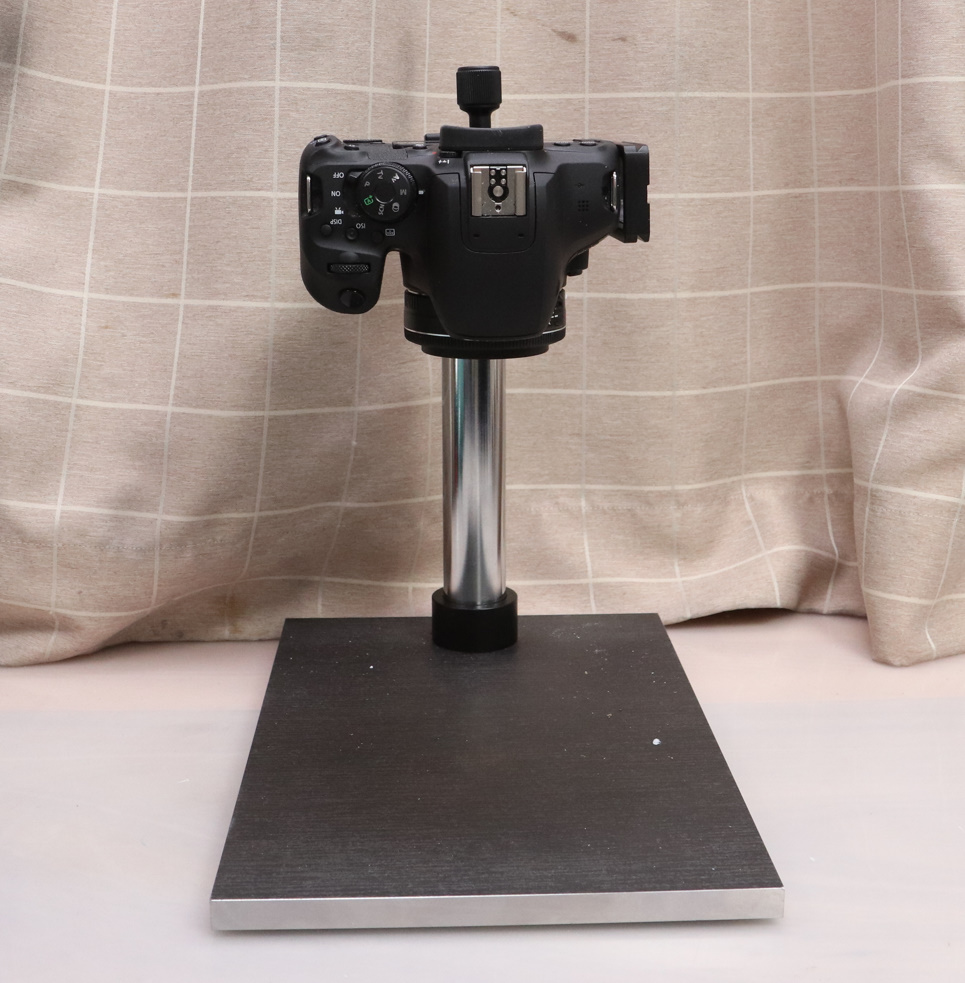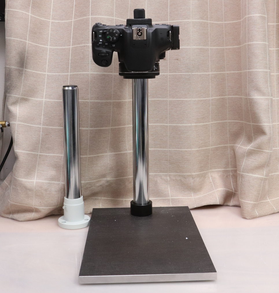 レオフォト C-32でカメラを取り付けた、実体顕微鏡用の架台は、コビースタンド程ではないものの、操作性は悪くなく、台分部は小さい物の重量のある金属の厚板なので安定感は高く、LPLのコピースタンドの代わりとしては理想的な物となりました。