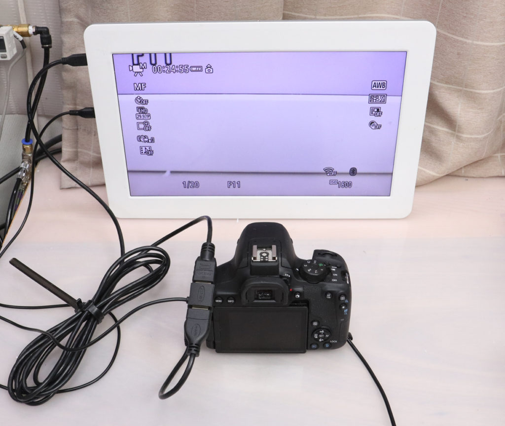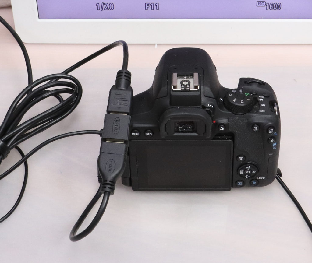 EOS Kiss X10iとOn-lap 1303Hの組合せに、 HDMIケーブル用補助電源ケーブルを使った様子を動画撮影しました。