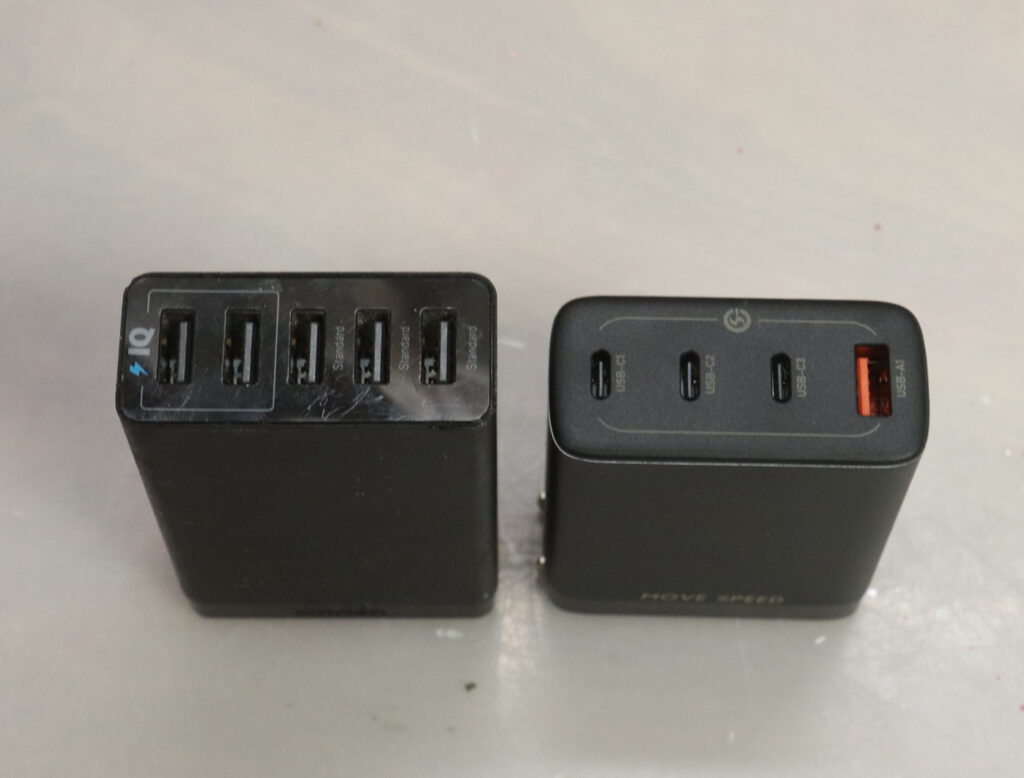 今まで使っていたAnkerの5ポート25W充電器(iQポートだと最大15W、5つのポートを同時に使うと、各ポートは5V1Aの5W、5つの合計は25W) 充電器と同じ様に、眼鏡ケーブルに対応した商品の方が好みでしたが、実際に使ってみたら、使い勝手は悪くなく、すぐに慣れました。