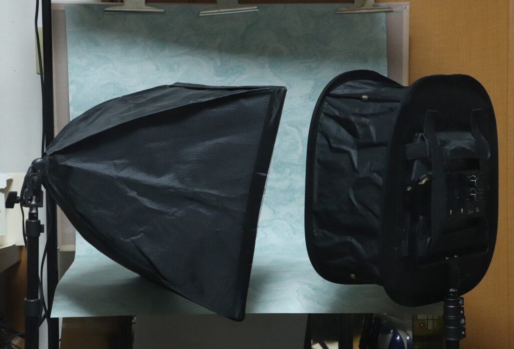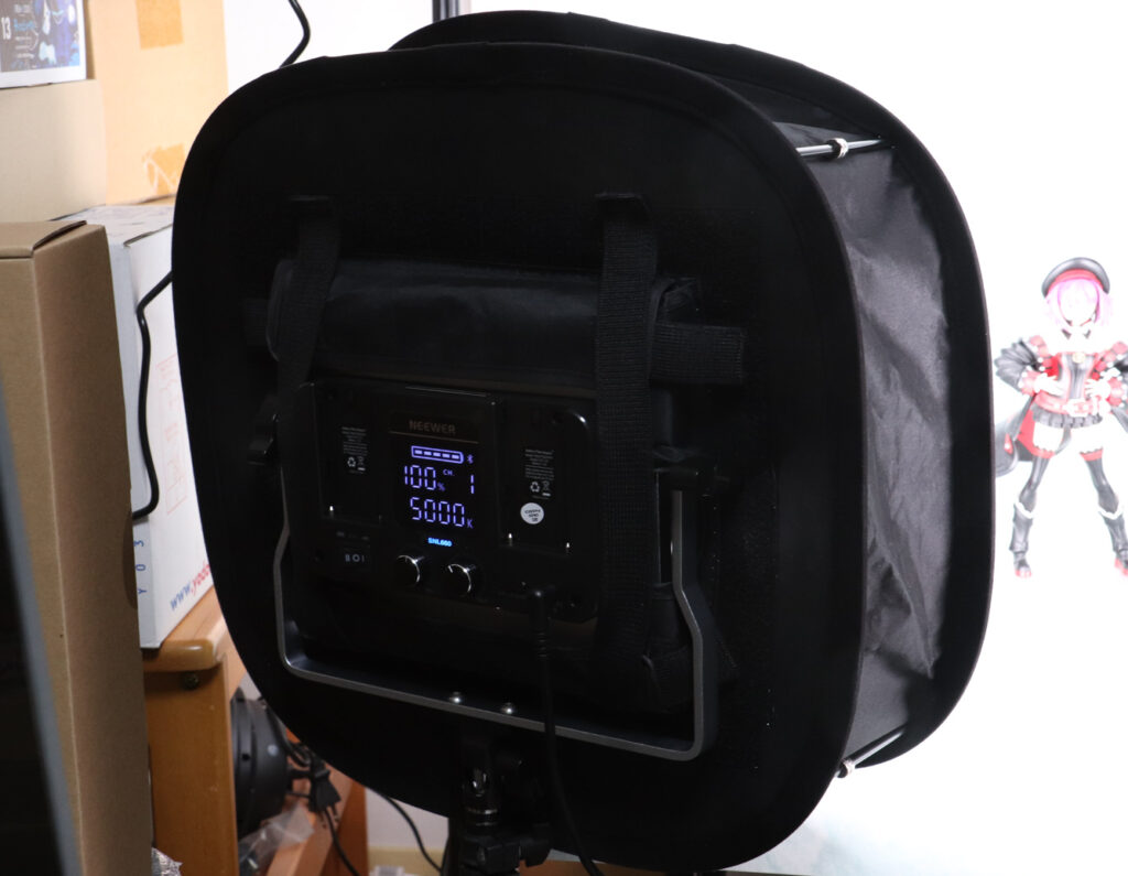 NEEWER NL660は専用デフューザーを取り付けても、写真左の電球型LED照明を取り付けたライトバンクよりも大幅に小型化出来ました。