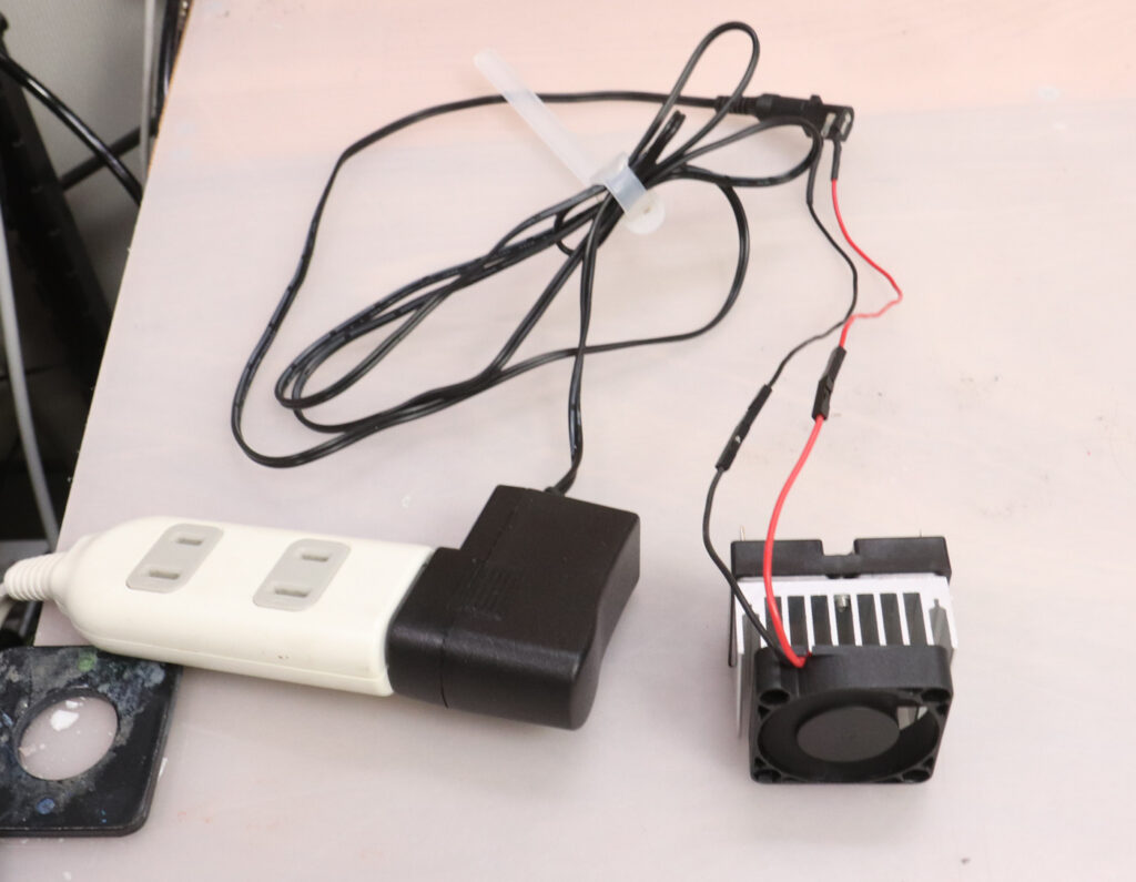 DC5VのACアダプターを使ったファンの動作確認の様子。
