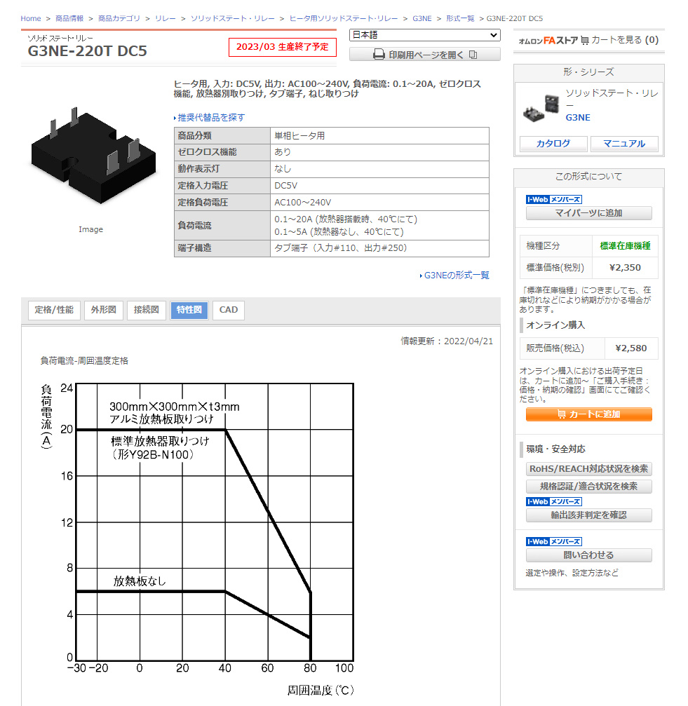オムロンのG3NE-220Tの製品ページによると、GNE-220Tは2023年3月に生産終了予定で、海外での販売に対応したG3NE-220T-USに一本化するみたいです。