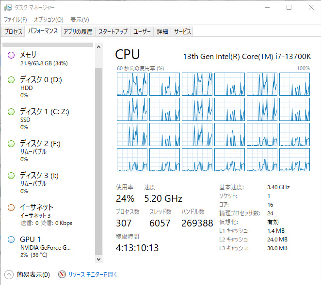 Core i7 13700Kは処理速度が必要な時には5Ghz以上のクロックスピードを常用している様で、複数コアやスレッドを有効に活用できないソフトでも、5Ghzオーバーの恩恵を受けられるので隙がありません。