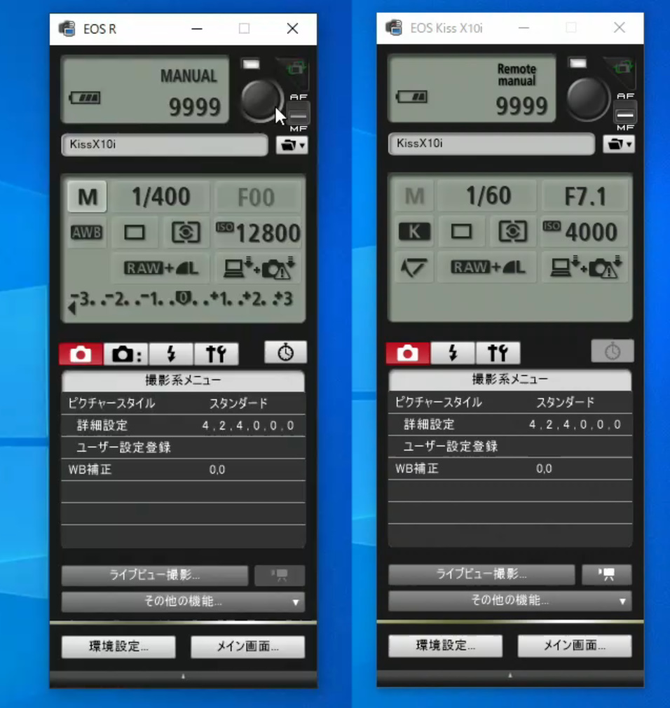 EOS Kiss X10iのではEOS Utilityのリモート操作パネルの撮影モードはグレーアウトして操作して変更できませんが、EOS Rでは変更可能となっていました。