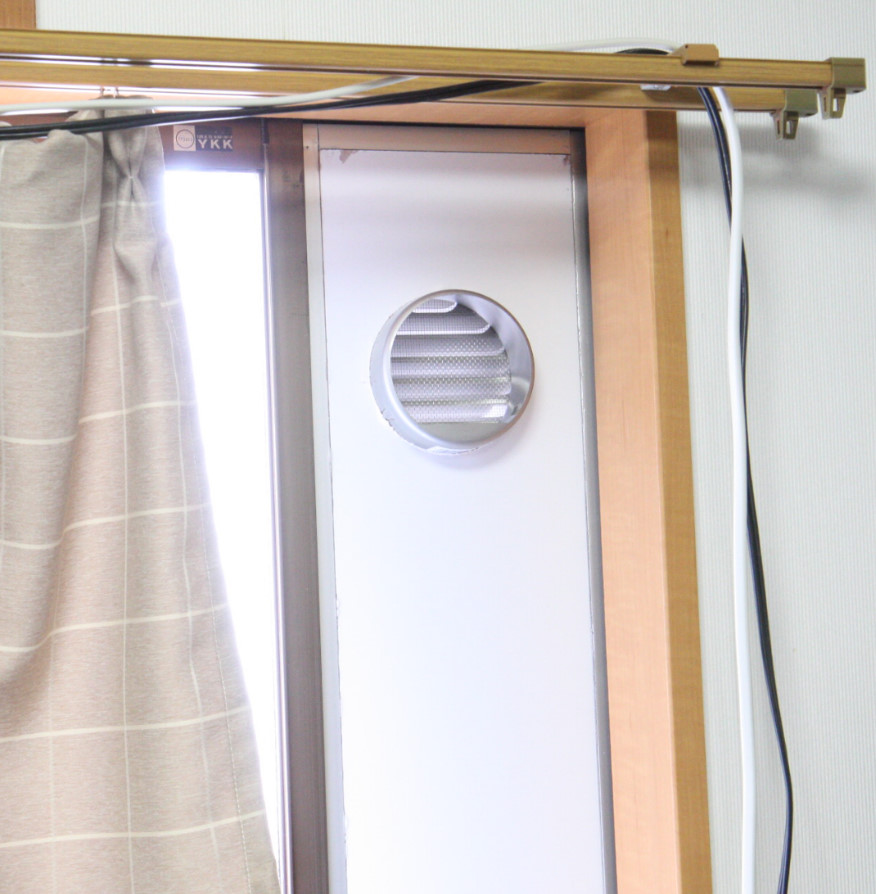 室外への排気用のダクト穴は窓に挟んで固定出来るパネルを自作しました。