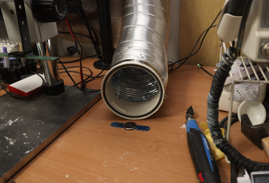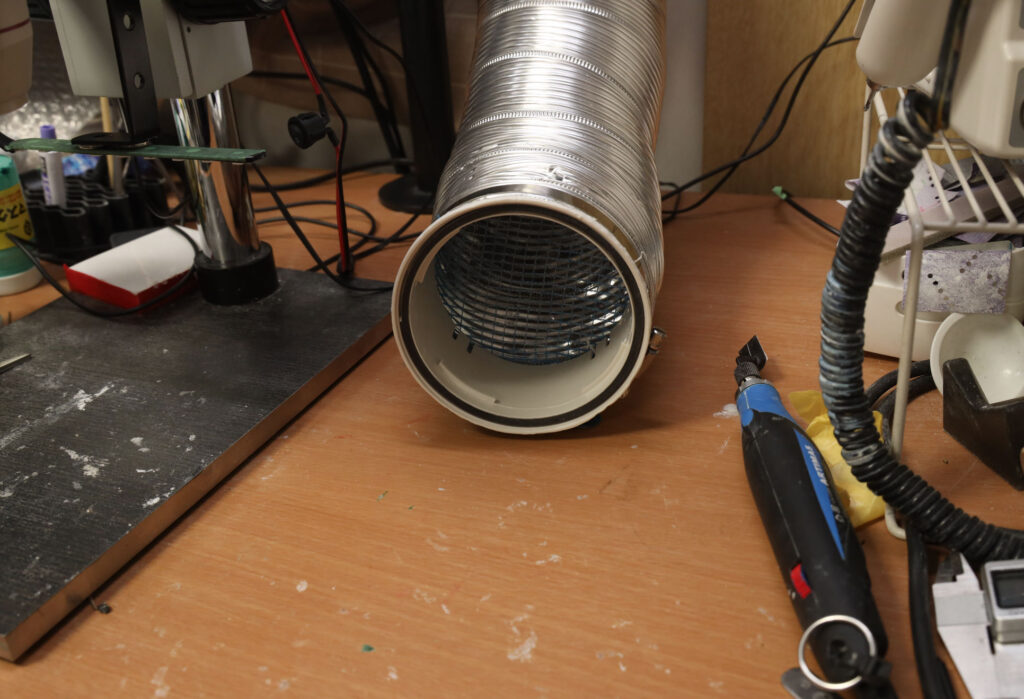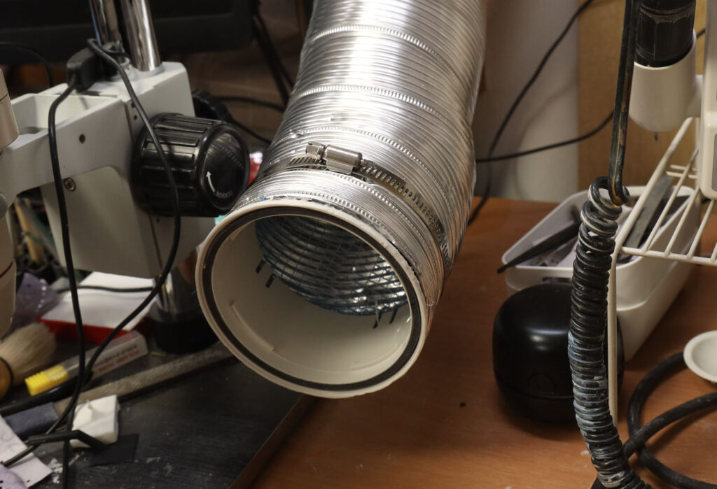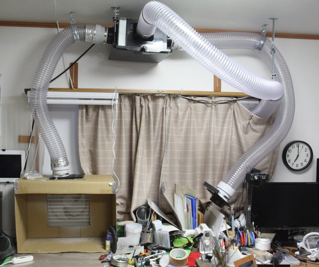 塩化ビニール製のダクトは、頑丈さの反面、アルミダクトの様な伸縮性や曲げやすさは無いので、写真の様に上から吸い込む形で使うくらいしかできませんでした。
